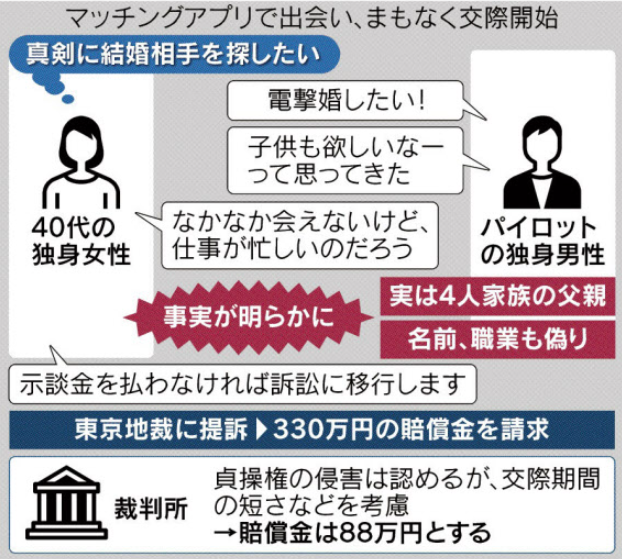 令和7年9月14日(日)付の新聞に、『婚活アプリ「独身」の嘘~貞操権侵害訴訟「だまされて、もてあそばれた」~「結婚への関係」か争う』の記事がありました。