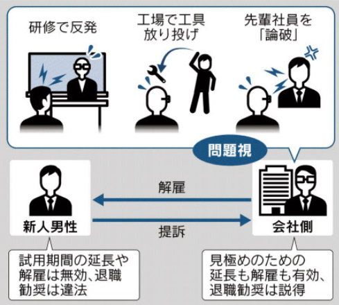 結局会社試用期間延長「追い出し部屋」新人を入れ説得を続けるも態度は変わらず、そこで会社8月末解雇予告通知書交付9月末解雇した所、新人「不当解雇だ」労働審判を申し立て、最終的に裁判となりました。