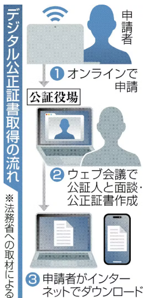 実際に利用する場合は、まずインターネットで申請し、ウェブ会議システムを通じて公証人と面談する流れになります。