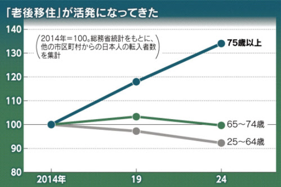 記事では、他の市区町村に移り住む75歳以上の後期高齢者が10年で3割増え「老後移住」が活発になっている実態が紹介されています。