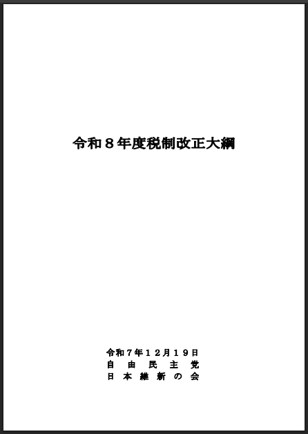 令和7年12月19日(金)、例年より少し遅れて与党(自由民主党及び日本維新の会)から「令和8年度税制改正大綱」が発表されました。