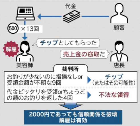今回は、会計時にレジから500円を「チップ」としてたびたび懐に入れていた女性美容師の解雇を巡り適法か違法かが争われた事件が取り上げられています。