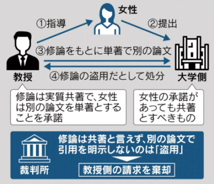 教授は「共著だった、女性から了解を得ている、8割以上は自分が貢献したため盗用には当たらない」と処分無効及び慰謝料500万円を求めて大学を提訴しました。