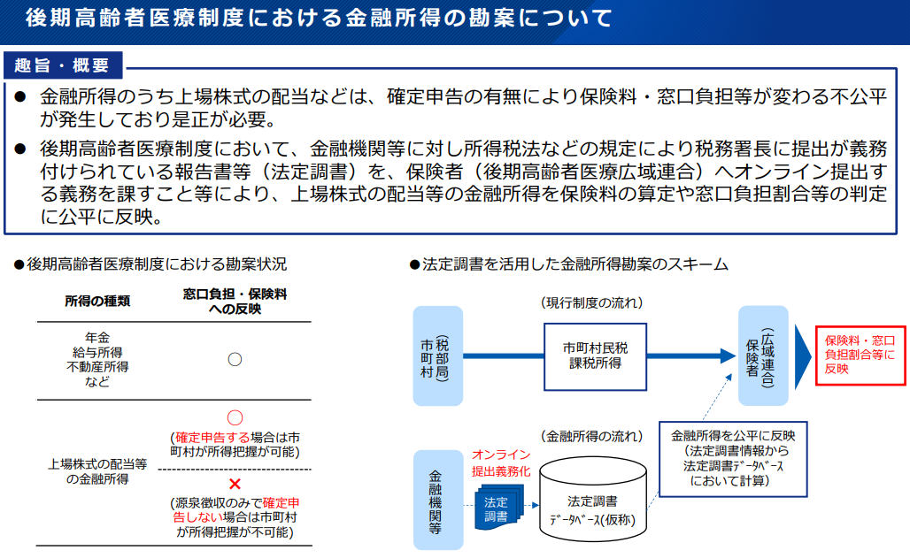 2026年3月13日、上場株式等の配当等の金融所得を後期高齢者医療保険料の算定や窓口負担割合に反映させる「健康保険法等の一部を改正する法律案」が国会に提出されました。